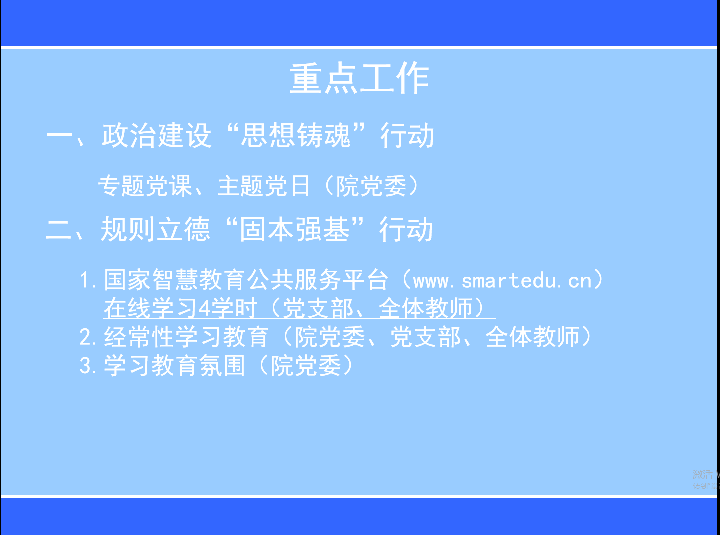易超书记首先传达学习学校《关于在全校开展师德集中学习教育》工作通知精神,并围绕扎实开展政治建设“思想铸魂”行动、规则立德“固本强基”行动、专项整治“清朗净化”行动、关键群体“教育提升”行动、以案明纪“警钟长鸣”行动和榜样引领“典型赋能”行动六项重点工作进行党员部署做学院开展学习教育部署动员。