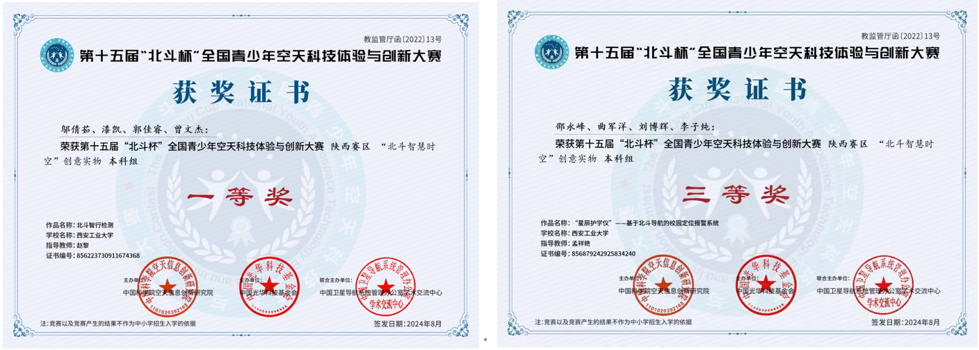 2024年7月27日,第十五届“北斗杯”全国青少年空天科技体验与创新大赛陕西分赛在西安理工大学曲江校区隆重举行。“北斗杯”全国青少年科技创新大赛由教育部科学技术司、共青团中央等单位共同主办,是我国青少年科技教育领域的一项重要赛事,旨在激发青少年对科技创新的兴趣,培养北斗创新人才。来自全省各地的800多名青少年科技爱好者齐聚一堂,共同参与这场盛大的科技竞赛。经过激烈角逐,我校由邬倩茹、漆凯、郭佳睿、曾文杰组队的作品“北斗智行检测”获得了省赛一等奖,由邵永峰、曲军洋、刘博辉、李子纯组队的作品“星辰护学仪”获得了省赛三等奖。
