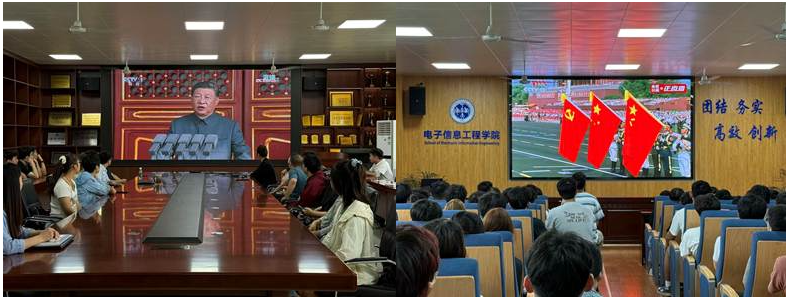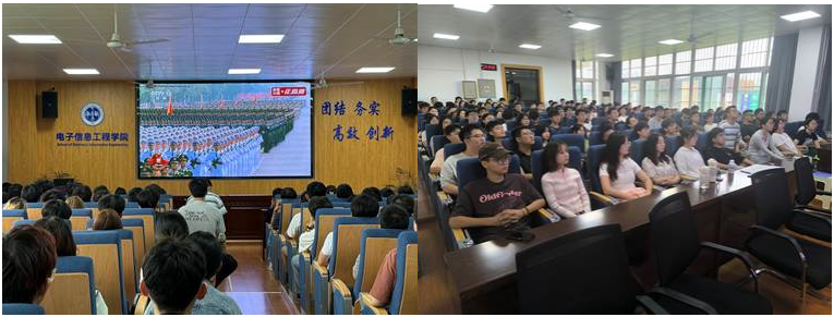 学院师生集中观看阅兵直播,现场秩序井然、氛围庄重。随着受阅部队和新型武器装备依次亮相,大家心潮澎湃,内心充满自豪与振奋。特别是在信息化、智能化等与电子信息领域密切相关的装备接受检阅时,师生们倍感鼓舞,进一步增强了专业认同感和强烈的责任担当。此次集中观看活动不仅加深了对国家发展的认识,也进一步增强了民族自豪感、责任感和使命感。