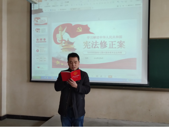 书记张忠则从宪法的性质、地位、发展变化、核心内容、关系、依据、实施、作用等八个方面具体展开,全面系统的阐述了宪法的重要性和宪法修正案审议通过的迫切性。她结合今年两会的机构改革、宪法修订等热点事件阐述了宪法是国家的根本法,是治国理政的总章程,是党和人民意志的集中体现;宪法在整个法律体系中具有最高的法律地位、法律权威、法律效力;宪法只有不断适应新形势、吸纳新经验、确认新成果,才能具有持久生命力;公民的基本权利和义务是宪法的核心内容,宪法是每个公民享有权利、履行义务的根本保证;坚持依法治国首先要坚持依宪治国,坚持依法执政首先要坚持依宪执政。并最后总结强调,要求全院教师要自觉践行崇尚宪法、遵守宪法、捍卫宪法的精神,不断学习宪法、增强宪法意识、维护宪法权威。