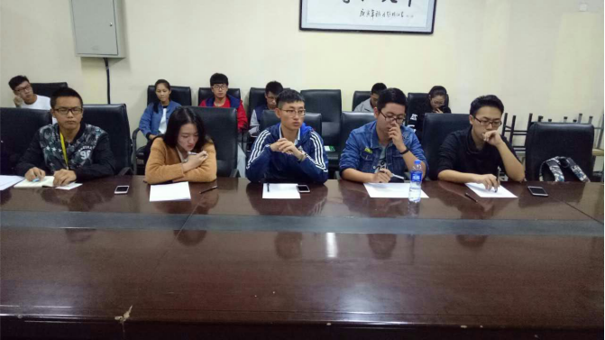 2016年10月11日晚,电信学院于工5-402举行了2016级迎新主持人选拔的面试工作。出席本次活动的有团委书记赵志升,团委副书记张国豪,社团联合会主席李星宇,社联秘书长邓若兰,社联外联部长石国良。