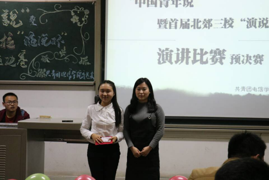 晚上6时许,“中国青年说”首届北郊三校“演说杯”演讲比赛预决赛在一段酷炫的开场视频中正式开始。接着,两位主持人为大家介绍了到场嘉宾以及九位选手并播放选手的VCR。随着赛程的进行,选手们一个接一个的展示精彩的演讲。第一轮演讲文稿由选手自己准备,所有的选手都积极的展现自我,自信沉着,不负众望,凭借流利的口才、自信的姿态和自然丰富的肢体语言展示了当代青年大学生的风采,赢得了评委和同学们阵阵掌声。其间伴着文艺部的同学为我们带来的美妙的歌曲,使会场气氛更加热烈。第一轮演讲结束后,团委副书记张国豪进行总结。在文艺部的同学优美的歌声过后,比赛继续进行第二轮。第二轮演讲是选手在第一轮自我演讲结束后,自己抽取即兴演讲主题,每位选手通过冷静的分析、镇定的思考加上严谨的语言,为我们带来了又一场视觉与听觉的盛宴。最后,由电信学院团委副书记夏开成老师进行总结,对同学们的表现进行点评。在欢跃的音乐中,主持人宣布本次比赛获奖名单,由嘉宾授予选手证书并合影留念,比赛于8时30分结束。
