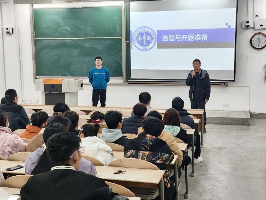 为进一步强化“抓关键环节,促培养质量”的研究生培养理念,帮助研究生更好地完成学位论文选题及开题,提高学位论文质量,学院于11月30日在教1-102开展了关于研究生选题及开题相关问题的指导与交流。学院邀请张峰教授主讲,会议由辅导员刘叶楠主持,2022级全体研究生和部分2023级研究生参加。