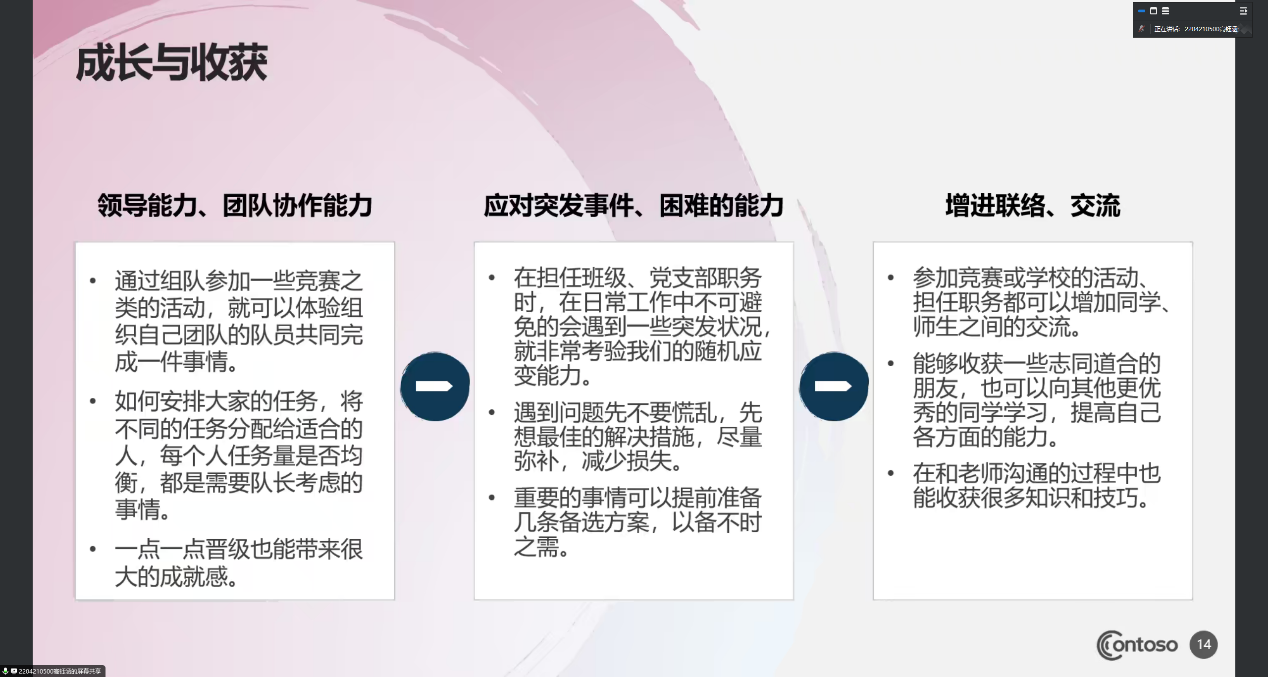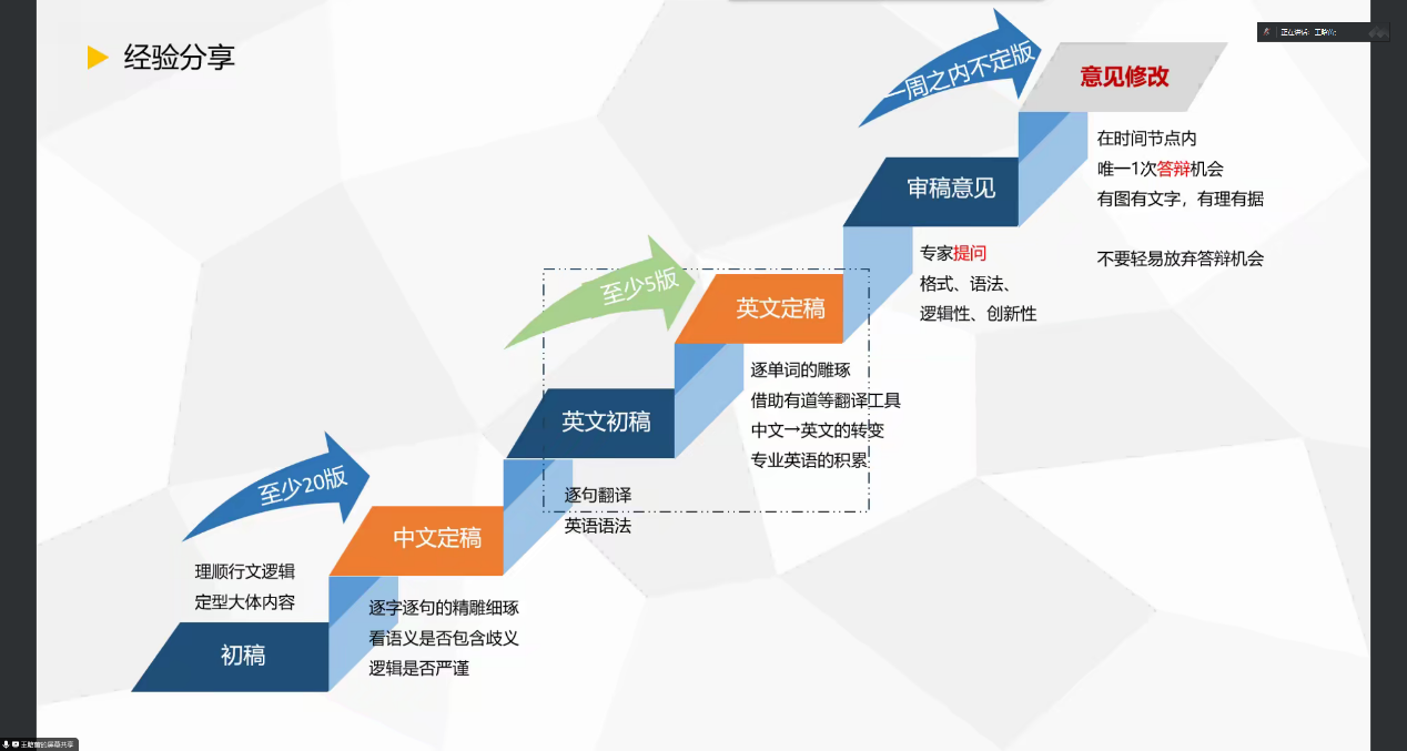 孙天誉分享了他在获奖和求学过程中的感悟和心得,鼓励大家坚持努力学习,不要迷茫,相信只要付出努力就能取得优异成绩。王晗蕾分享了她在英文论文投稿方面的经验,包括修稿过程和处理审稿意见的技巧,并强调了提出高质量问题和寻找创新点的重要性。最后,高钰涵同学分享了她获得国家奖学金的学习经验,重点强调了研究生阶段学业的重要性,分享了课程复习技巧,以及担任学生干部和参与竞赛所带来的成长与收获。