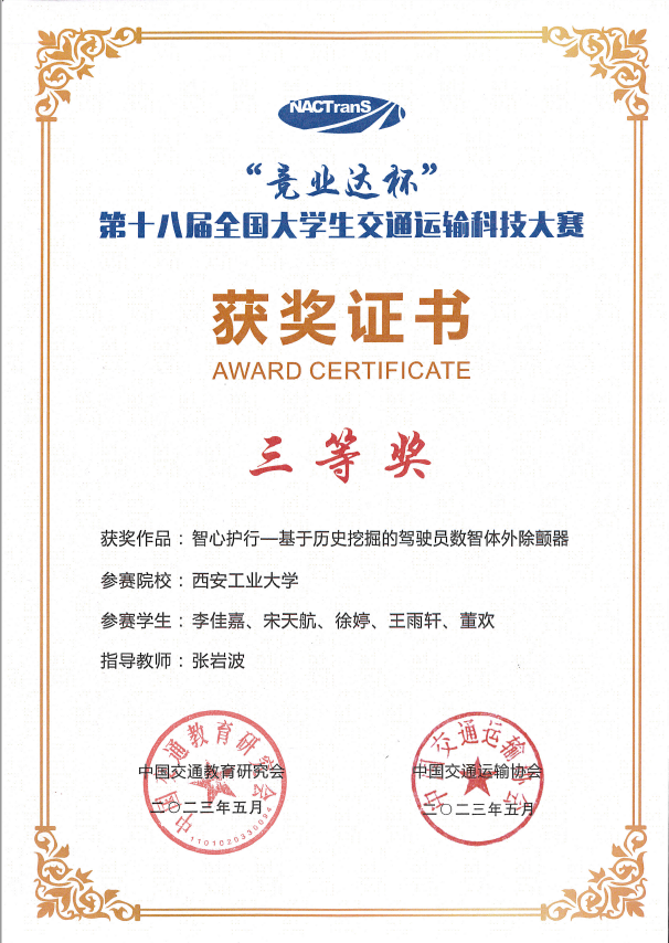 我校张岩波老师指导永利集团304李佳嘉等5名本科生完成的项目《智能护行—基于历史挖掘的驾驶员数智体外除颤器》,斩获全国三等奖1项,是目前我校在交通运输领域国家级学科竞赛的最好成绩。