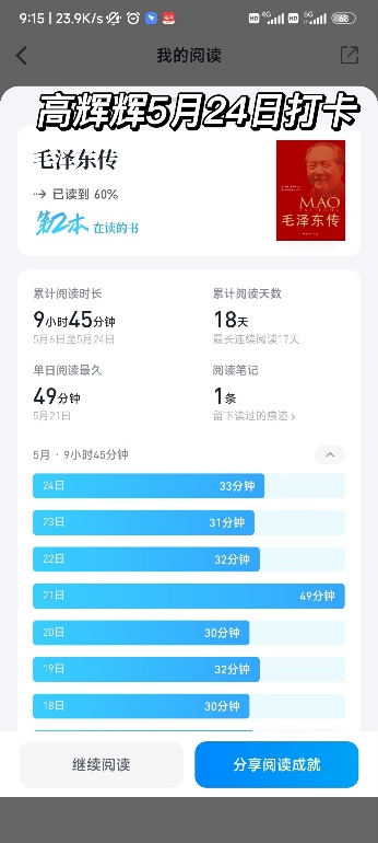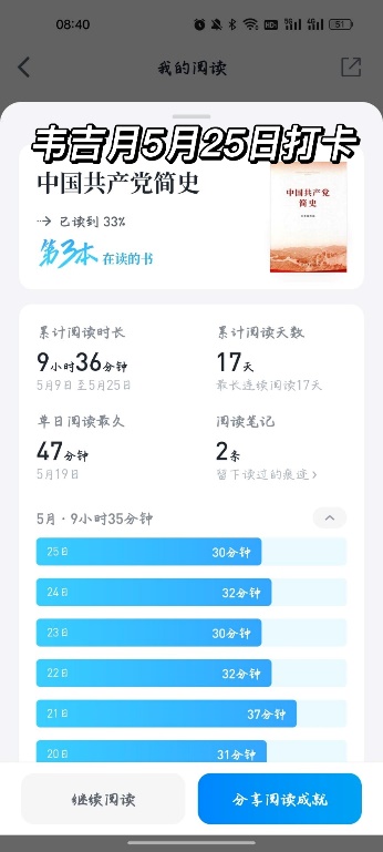 本次活动通过21天连续在规定时间内进行线上阅读打卡并最终分享读书心得的形式开展,推荐书籍为《红岩》、《把一切献给党》、《毛泽东选集》、《铁道游击队》。我院研究生踊跃报名,90余名研究生参加此次活动,借此来提高自己的思想水平。参加活动的研究生每日阅读后坚持按时打卡,认真记录读书心得。