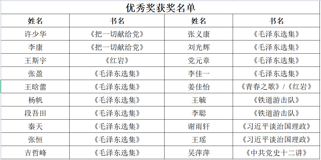 本次活动设置特等奖和优秀奖,经遴选共有48名研究生获得相应奖项,为鼓励研究生传承红色经典,多读书、读好书、读经典,学院为获奖研究生发放纪念奖品一份,名单如下: