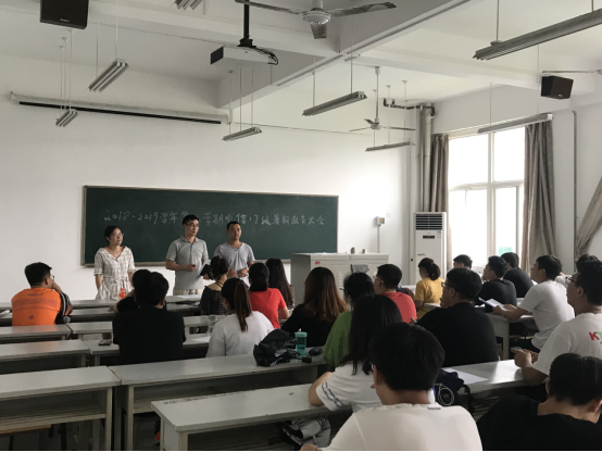 会上,夏老师首先对2017级实行分班管理的调整事宜进行了说明,并对李彬、郜辉两位新老师进行了介绍,叮嘱学生不要因为辅导员老师工作体制的调整而影响自己,广大同学要用积极地心态适应新变化,充分利用好大三学年的时间,踏踏实实学习实现自己的目标规划。