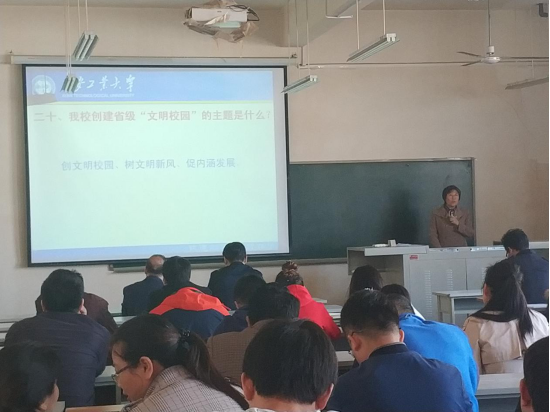 动员大会上,张书记首先引用习主席的一句话作为开场,“高校要走在精神文明建设前列,广泛开展文明校园创建,提升校园文明程度,努力打造良好育人环境。”然后按照创建省高教系统“文明校园”宣传教育提纲带领所有老师学习了“文明校园”的28个内容。