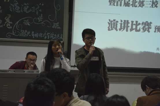 晚上6时许,“中国青年说”首届北郊三校“演说杯”演讲比赛预决赛在一段酷炫的开场视频中正式开始。接着,两位主持人为大家介绍到场嘉宾以及九位选手播放选手的VCR。随着赛程的进行,选手们一个接一个的展精彩的演讲。第一轮演讲文稿由选手自己准备,所有的选手都积极的展现自我,自信沉着,不负众望,凭借流利的口才、自信的姿态和自然丰富的肢体语言展示了当代青年大学生的风采,赢得了评委和同学们阵阵掌声。其间伴着文艺部的同学为我们带来美妙的歌曲,使会场气氛更加热烈。第一轮演讲结束后,团委副书记张国豪进行总结。在文艺的同学优美的歌声过后,比赛继续进行第二轮。第二轮演讲是选手在第一轮自我演讲结束后,自己抽取即兴演讲主题,每位选手通过冷静的分析、镇定的思考加上严谨的语言,为我们带来了又一场视觉与听觉的盛宴。最后,由电信学院团委副书记夏开成老师进行总结,对同学们的表现进行点评。在欢跃的音乐中,主持人宣布本次比赛获奖名单,由嘉宾授予选手证书并合影留念,比赛于8时30分结束。
